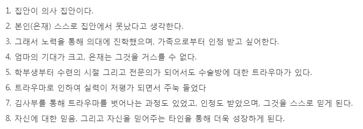 은재가 의사가 되려던 이유는 엄마가 좋아했기 때문에 힘든 학부생 시절과 트라우마를 버텨냈었다.